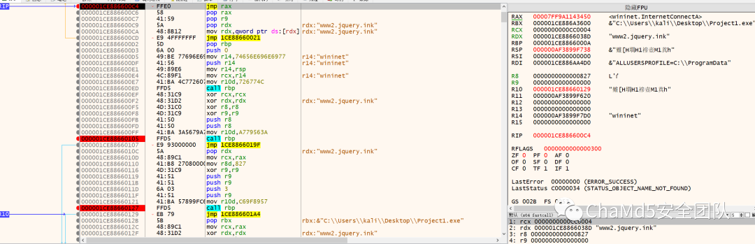 Host: www2.jquery.ink\r\nAccept: */*\r\nAccept-Language: en-US,en;q=0.5\r\nConnection: close\r\nUser-Agent: Mozilla/5.0 (compatible; MSIE 9.0; Windows NT 6.1; WOW64; Trident/5.0; MAAU)\r\n这一套下来后,如果HttpSendRequestA失败,则结束;如果成功,则继续后续操作。此时已经是CobaltStrike自动生成木马,分析流量无益,读者感兴趣可以自行分析。