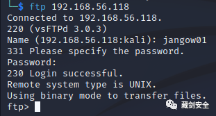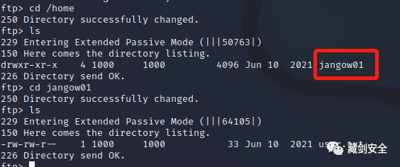继续尝试用账号密码进行FTP登陆,提示登陆成功随后cd到不同的目录中,查找文件,由于当前为www权限,进入目录很多无权限。进入到home目录下,发现关键信息
