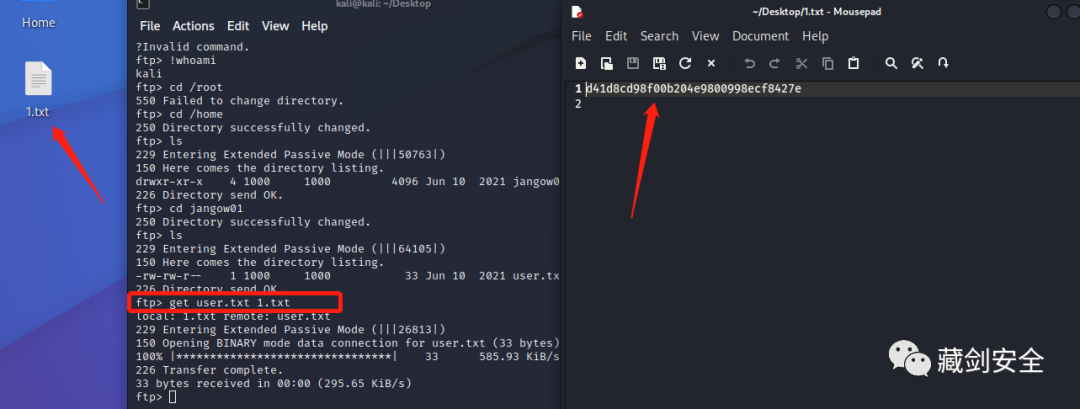 jangow01文件夹下存放了user.txt,使用FTP命令下载到本地打开