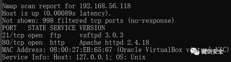 靶机IP:192.168.56.118,Nmap进行端口扫描,靶机开放80以及21FTP端口,尝试FTP弱口令是否能登陆,经测试,anoymous/anoymous弱口令不存在。随后访问80端口,web站点出现,PHP站点+Apache中间件。