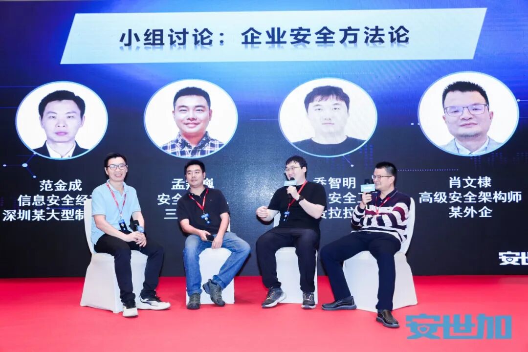下午分会场最后一个环节是由来自深圳某大型制造业的 信息安全经理 范金成、三一重工的安全负责人 孟翔巍、货拉拉的资深信息安全工程师 乔智明、某外企的高级安全架构师 肖文棣组成的小组讨论:企业安全方法论。