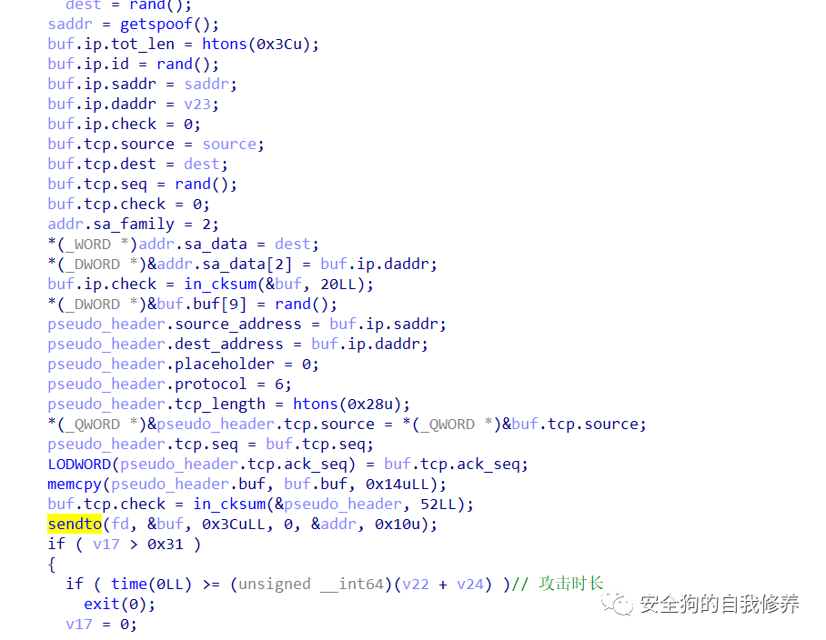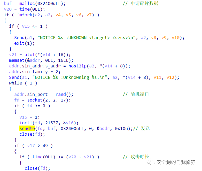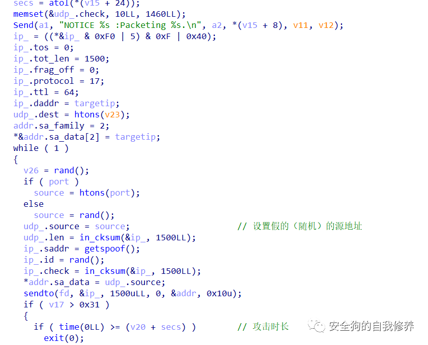 除发送垃圾数据包外,其余攻击方式均伪造假的数据封包,欺骗目标系统调用资源处理数据包。详细分析见下文逆向细节。