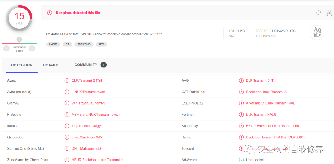 样本属于Tsunami家族,DDoS攻击程序,活跃时间为2013年至今。该家族使用的攻击手段包括TCP、UDP、DNS泛洪攻击。