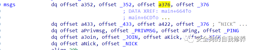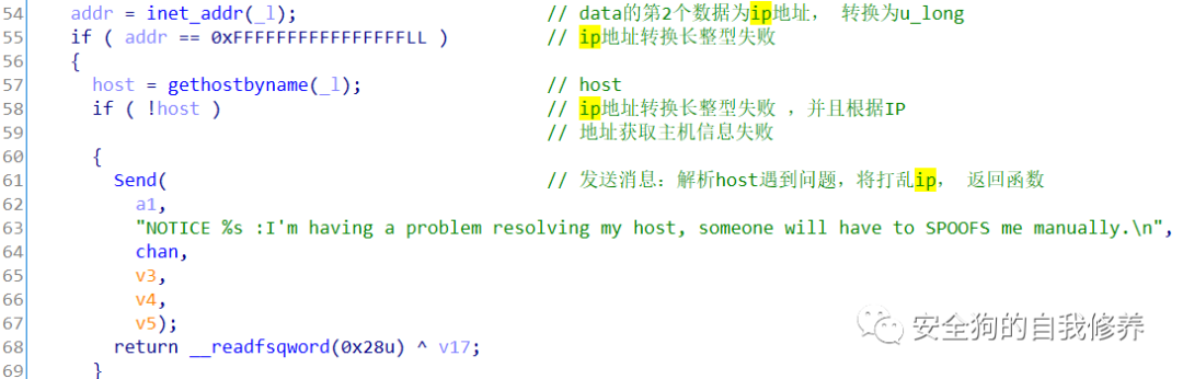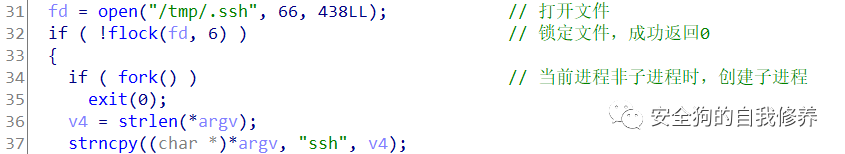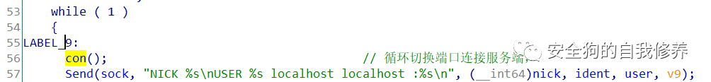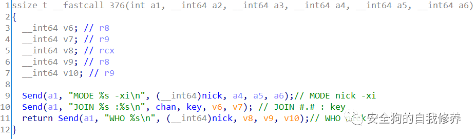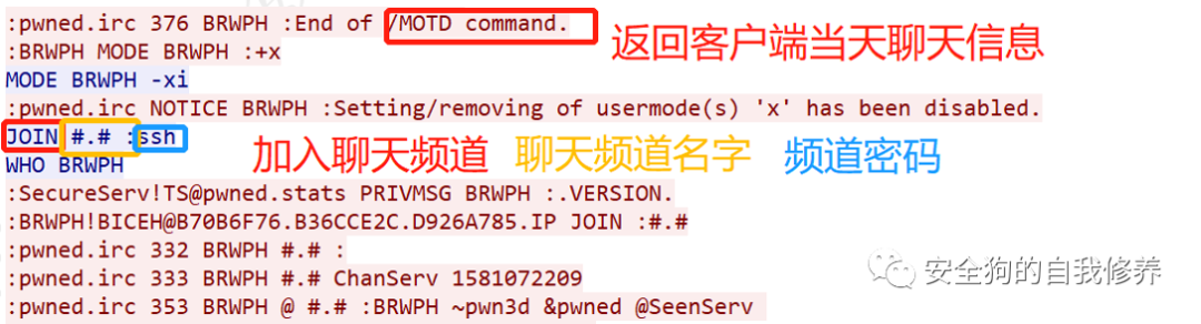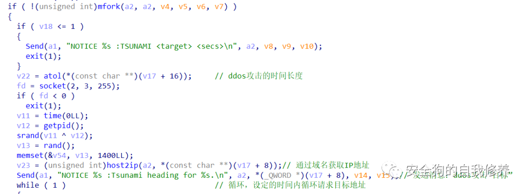 PRIVMSG | 接收irc命令,访问/usr/bin/xxh的目录下有没有SSH相关进程,如果有的话就关掉;从这里面进入ddos僵尸网络攻击 |