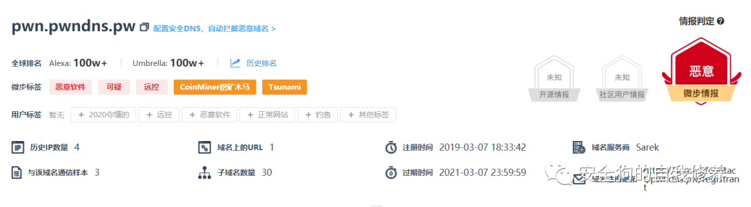 公开情报显示:该样本连接的IRC服务器地址关联到恶意软件、远控、挖矿木马、Tsunami泛洪等标签。