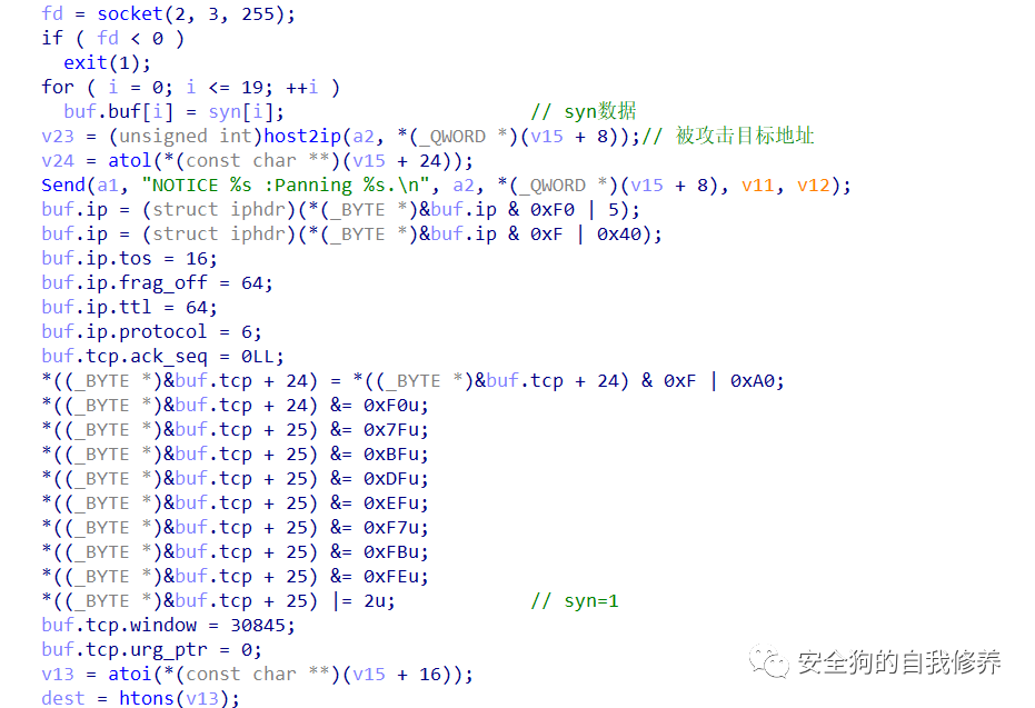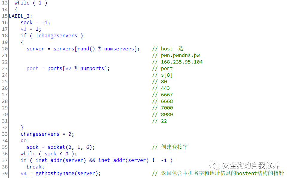 目前发现样本相关的源码已经公开在网络,适合分析者研究学习https://github.com/Soldie/COLE-O-botnets/blob/aec534acbf9789451f009129efaa1ec760973e2e/VirusPack/f34c5c27b.c