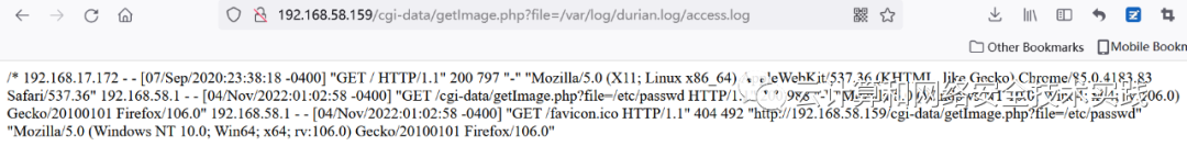 查看/var/log/durian.log/access.log,http://192.168.58.159/cgi-data/getImage.php?file=/var/log/durian.log/access.log,发现这个文件是用来做访问记录的,那就可以尝试上传webshell了,