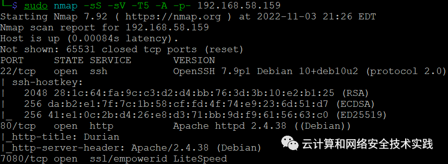 继续做端口扫描,sudo nmap -sS -sV -T5 -A -p- 192.168.58.159,