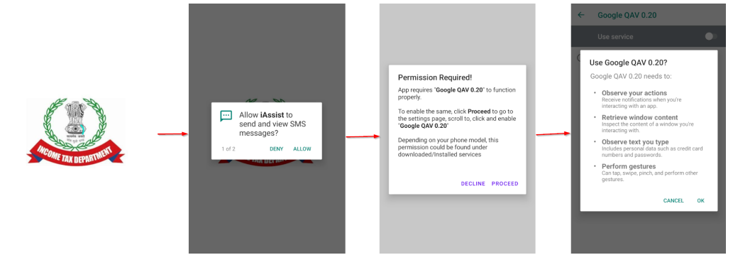 与许多其他银行木马一样,Drinik 的新变种依赖于 Accessibility Service 服务。启动恶意软件后,恶意软件会提示受害者授予权限,然后请求启用辅助功能服务,获取屏幕录制、禁用 Google Play Protect、执行自动手势和捕获关键日志所需的权限。然后 Drinik 恶意软件使用 WebView 加载与税务网站网页一模一样的虚假网页,在向受害者显示登录页面之前,恶意软件会显示一个用于生物特征验证的页面,诱导受害者输入 PIN ,恶意软件会通过使用 MediaProjection 录制屏幕并捕获按键来窃取生物 PIN 码。待身份验证后,恶意软件会将目标定向到虚假的印度个人所得税网站,引诱受害者输入敏感数据,然后将收集到的内容回传到 C&C 服务器。