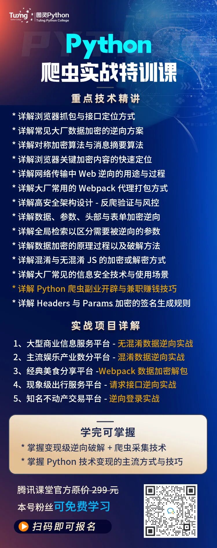 在这个万物互联的时代,人们在网络世界中的行为产生了大量数据,这些数据有着极大的商业价值。爬虫作为最好最快的数据采集技术,其重要程度不言而喻!虽说当前业界对爬虫服务的需求很大,且订单多报酬丰厚,但这钱也不是每个人都能赚,接爬虫私活需要有足够充沛的技术储备。技术不够,就接不到单。最近公众号后台收到超多人的留言,几乎全是关于爬虫技术的问题咨询。包括WebPack、数据逆向、请求参数逆向、多重加密解析、逆向登录、AES算法、RSA算法、Js混淆、二进制压缩、Js二次加密、Js逆向调试在内的爬虫相关技术,不断地被无数人反复问及。可见,大家都迫切地想要掌握Python爬虫技术。
