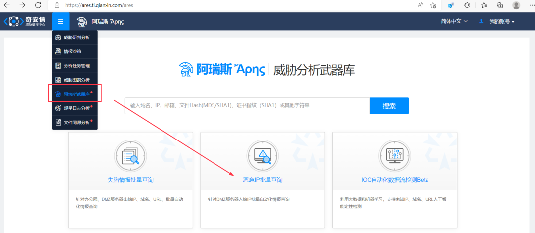 支持IOC自动化数据流检测、失陷情报、恶意IP批量查询