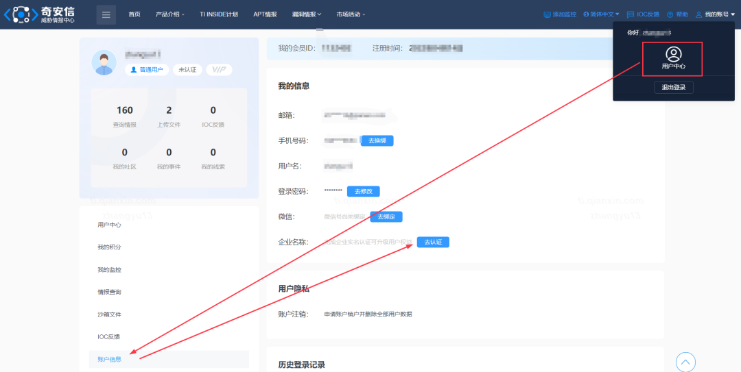 奇安信ALPHA威胁分析平台已面向全行业开放注册,用户可点击【阅读原文】注册登录使用,也可进行免费企业认证,体验更多高级功能。【路径:我的账号——用户中心——账户信息——企业名称(去认证)】