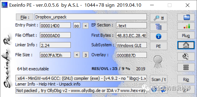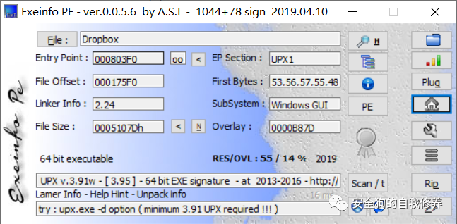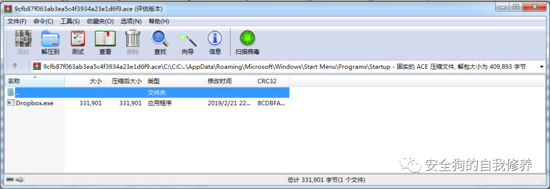 Dropbox.exe将在计算机启动时自动运行。其详细功能见逆向分析。3. 逆向分析3.1 CVE-2018-20250WinRAR目录穿越漏洞(CVE-2018-20250):该漏洞是由于WinRAR 所使用的一个陈旧的动态链接库UNACEV2.dll所造成的,该动态链接库在2006 年被编译,没有任何的基础保护机制(ASLR,DEP 等)。该动态链接库的作用是处理ACE 格式文件。而在解压处理过程中存在一处目录穿越漏洞,允许解压过程写入文件至开机启动项,导致代码执行。3.2 Dropbox.exe分析将Dropbox.exe脱掉upx壳![]()