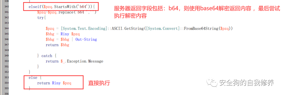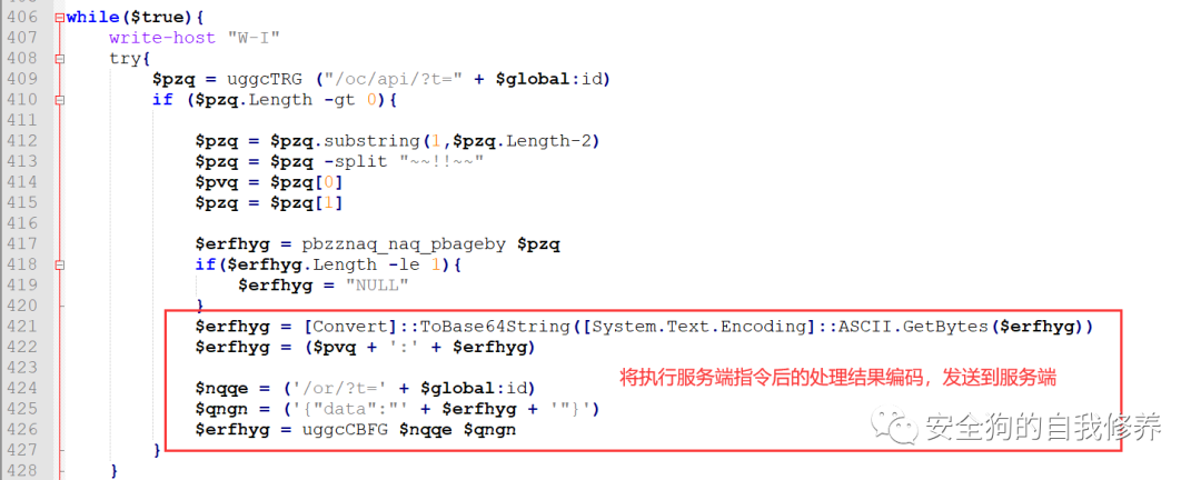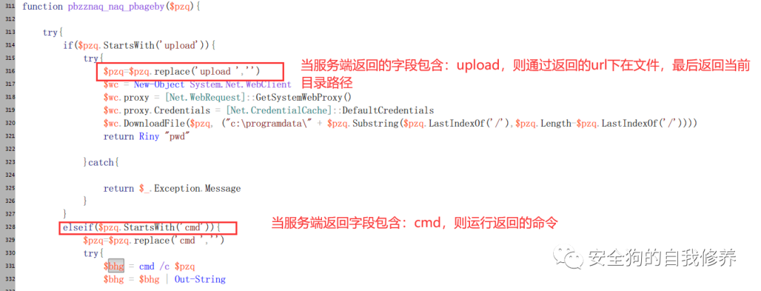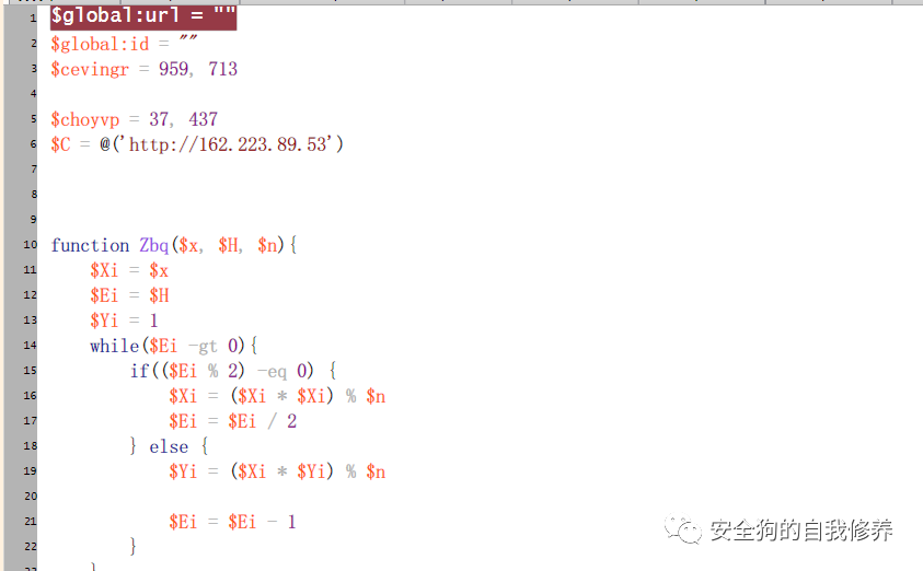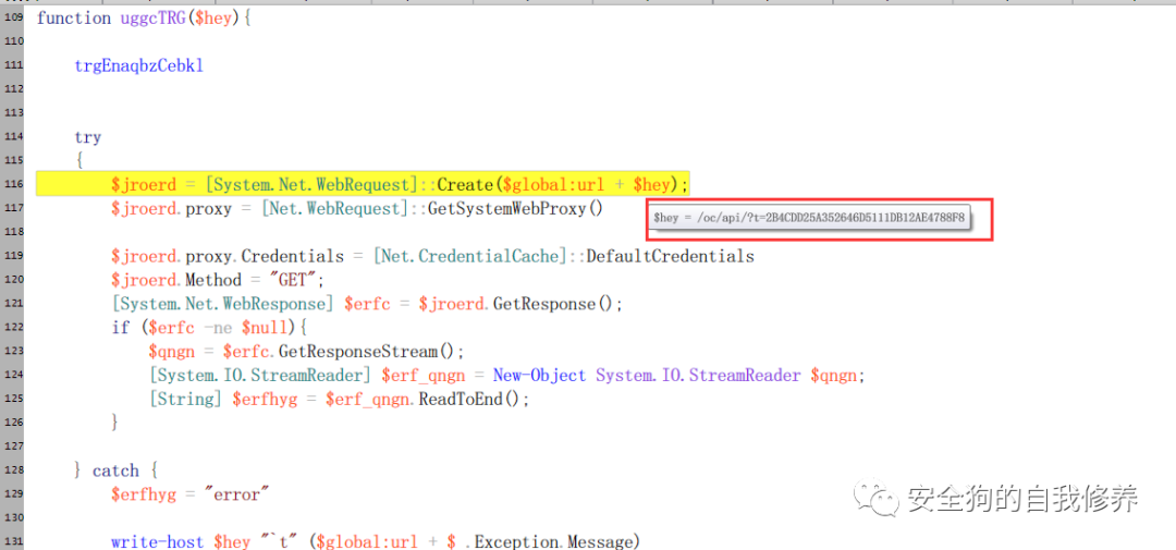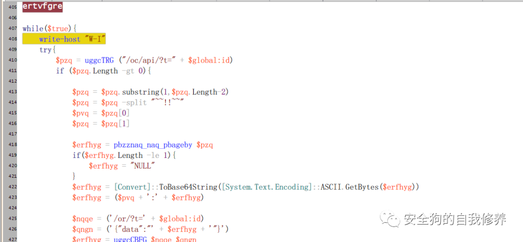 脚本使用Invoke-Expression指令,将混淆脚本代码字符串作为命令执行,并使用字符串反转、字符串替换等手段混淆脚本。修改替换Invoke-Expression指令对应的库,在执行iex函数执行命令时保存命令文本,得到如下明文脚本:![]()