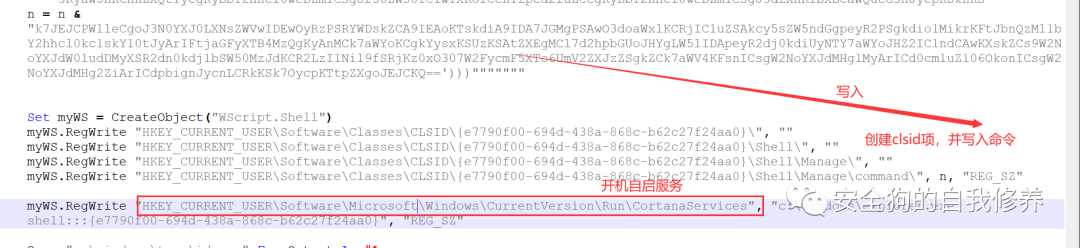 注册开机自启服务CortanaService,作用为—启动tmp.vbs无窗口执行解密脚本,解密脚本解密id.png文件,得到“被混淆的powershell脚本”,见下图。![]()