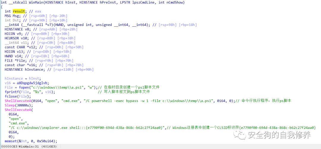 使用IDA Pro静态分析,主要行为:释放并执行ps1脚本。![]()