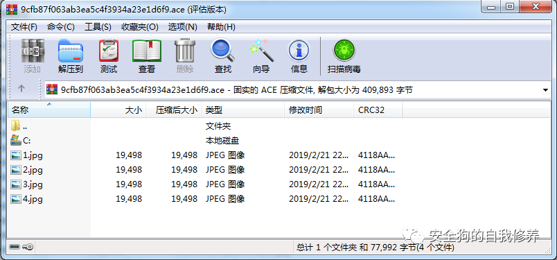 恶意PowerShell脚本分析该恶意文件为ACE压缩文件,内含4个jpg文件和一个PE文件,利用WinRAR漏洞(CVE-2018-20250),诱使受害者解压文件触发漏洞释放PE文件到启动目录,等