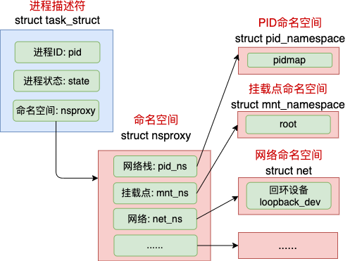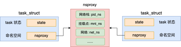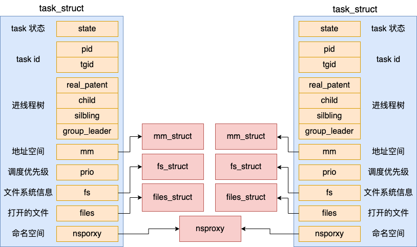 在创建进程或线程的时候,还可以让内核帮我们创建独立的命名空间。在默认情况下,创建进程没有指定命名空间相关的标记,因此也不会创建。新旧进程仍然复用同一套命名空间对象。