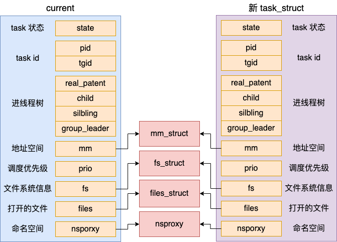 在 fork 创建进程的时候,地址空间 mm_struct、挂载点 fs_struct、打开文件列表 files_struct 都要是独立拥有的,所以都去申请内存并初始化了它们。但由于今天我们的例子父子进程是同一个命名空间,所以 nsproxy 还仍然是共用的。