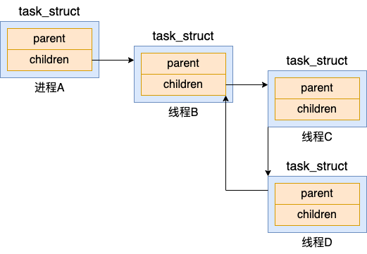 那么,这棵进程树就是由 task_struct 下的 parent、children、sibling 等字段来表示的。这几个字段将系统中的所有 task 串成了一棵树。