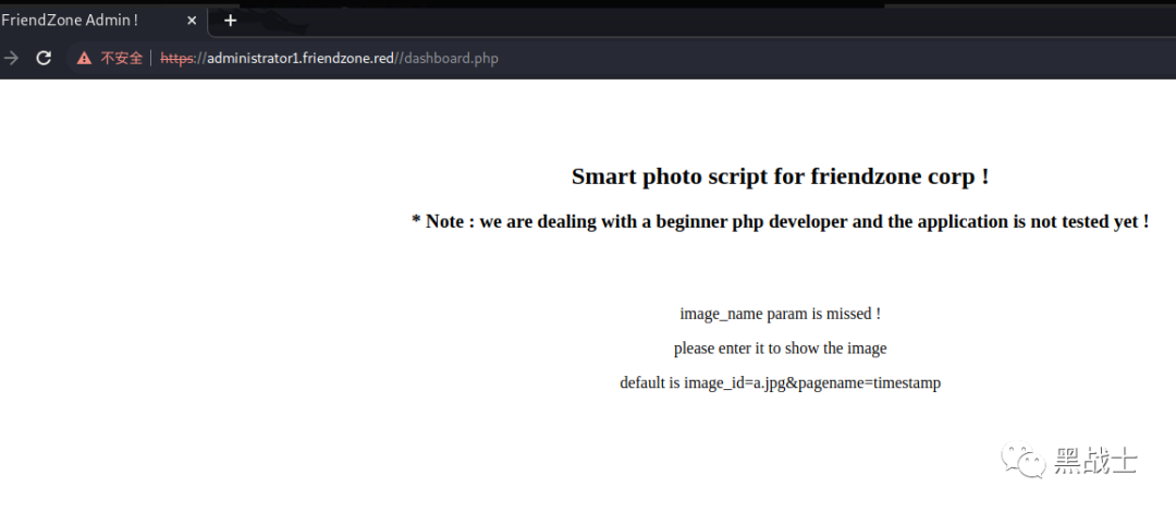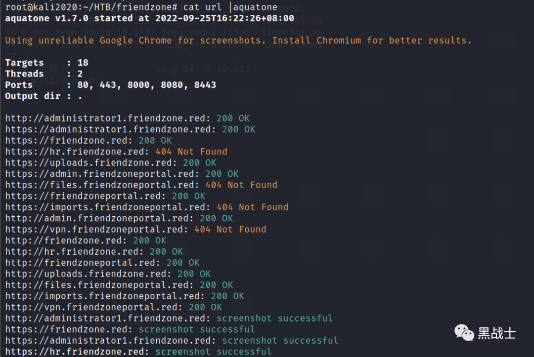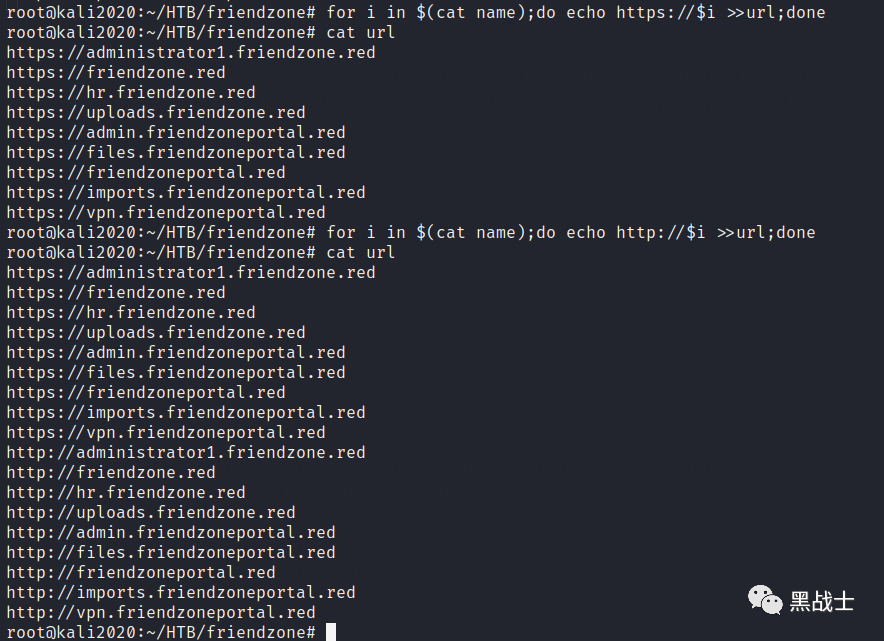 administrator1.friendzone.red friendzone.red hr.friendzone.red uploads.friendzone.red admin.friendzoneportal.red files.friendzoneportal.red friendzoneportal.red imports.friendzoneportal.red 因为这么多域名我们不可能挨个去手动访问,所以我们这里用工具来批量测试,在使用工具之前,我们需要首先把所有的域名放到一个文件里面,我这里放在了name文件里,然后我们通过如下简单的shell脚本,把这些域名处理成工具可以识别的url链接并写入到名为url的文件中,便于我们下一步的利用。