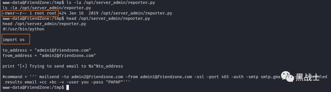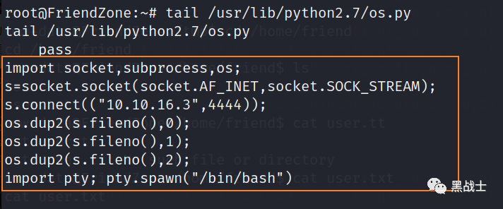 然后如上图所示,我们看到这个脚本是以root权限运行的,并且该脚本调用了OS库,所以接下来我们只需要在OS库中写入反弹shell的代码即可,如下图所示。