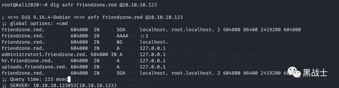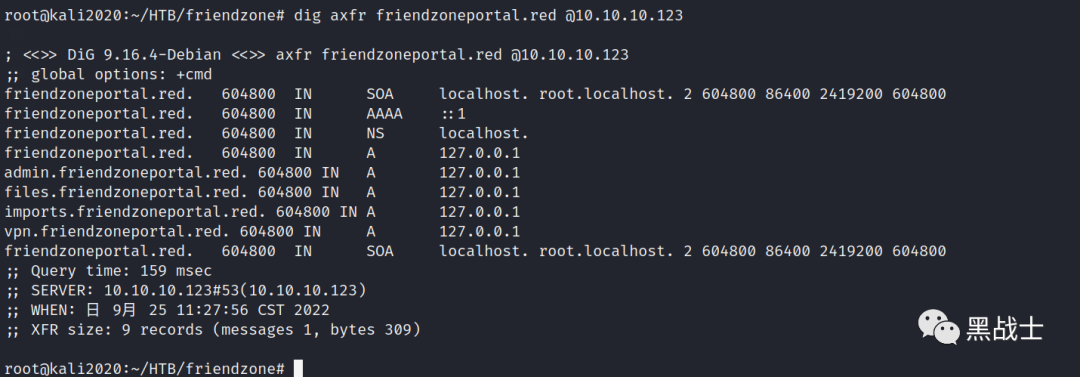 因为我们前面扫描的时候发现了53端口是开着一个dns服务的,所以尝试使用friendzoneportal.red进行axfr,它的具体含义简单来说就是使用dig命令向服务器发送一个axfr的请求,如果服务器支持axfr,那么就会把请求的域对应的所有的dns记录都返回给请求者。