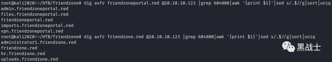 dig axfr friendzoneportal.red @10.10.10.123 |grep 604800|awk '{print $1}'|sed s/.$//g|sort|uniqdig axfr friendzone.red @10.10.10.123 |grep 604800|awk '{print $1}'|sed s/.$//g|sort|uniq#解析shell命令grep 604800 匹配含有604800数字的行awk'{print $1}' 将一行中以空格为分割符的第一个字段打印出来sed s/.$//g 将以点结尾的字符串末尾的点替换为空sort 排序uniq 删除文件中的重复行