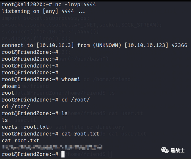 上图框中的代码就是我们加到os.py文件末尾反弹shell的代码,通过下图我们可以看到root权限的shell已经弹回来了。