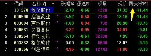 汉仪股份,周五信创20cm前排,今天冲高回落;声讯股份,周五医药二板,冲高回落;格尔软件,周五信创反包板,炸板回落;创意信息,盘中跟随虚拟现实轮动冲高,收盘回落;启迪药业,周五医药三板,今天冲高回落;久吾高科,盐湖提锂20cm,冲高回落;佳创视讯,中午虚拟现实轮动,午后冲高回落。