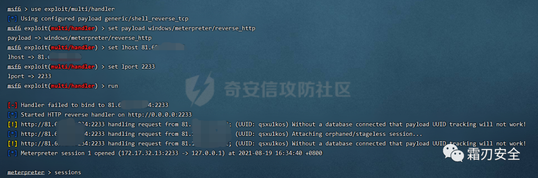 首先看了下,目标是出网机器之后尝试使用frp,nps等常规代理想把流量代理出来,发现无果,猜测目标做了限制,那么我们直接用公网的msf吧。CS4.3版本移除了foreign/reverse_tcp,所以我建立了一个foreign/reverse_http的listener,msf监听后,CSspwan,成功获得一个meterpreter