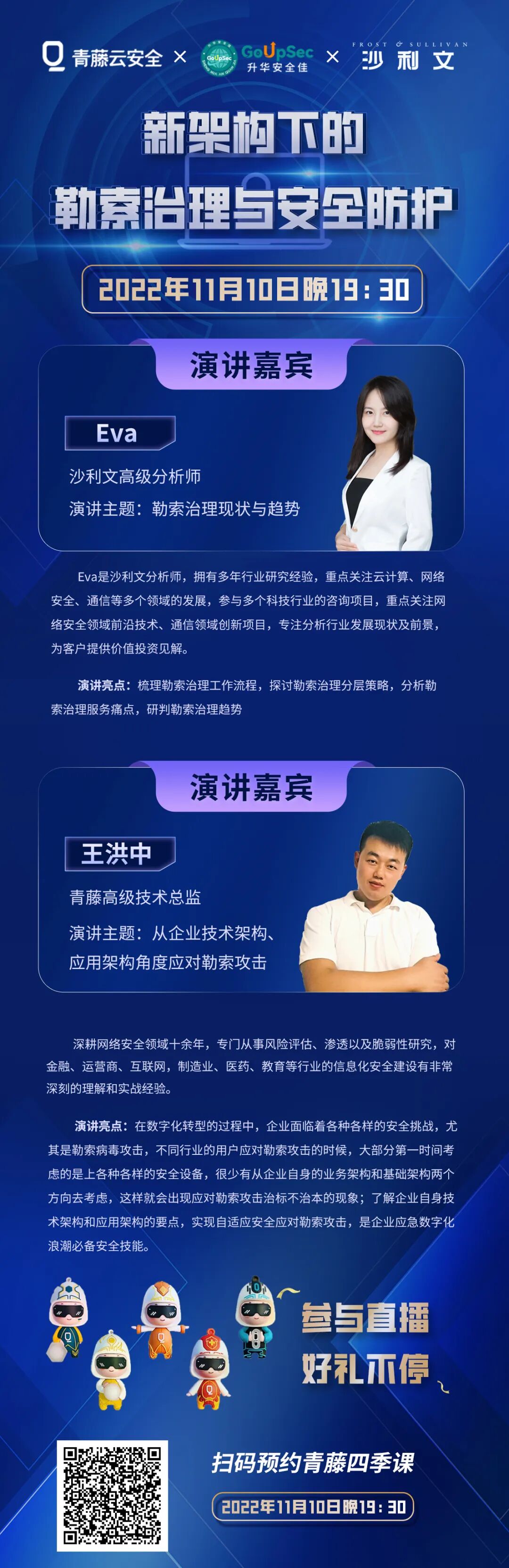 防御网络勒索迫在眉睫。所谓“知己知彼才能百战不殆”,面对新型勒索攻击,企业组织想要做好防御,对勒索攻击软件进行全面的了解十分有必要。基于此,青藤云安全邀请知名安全专家联合沙利文讲师于11月10日19:30进行一场以“新架构下的勒索治理与安全防护”为主题的直播课,以帮助企业了解自身技术架构和应用架构的要点,并实现自适应安全应对勒索攻击,提高企业在数字化浪潮中的安全能力。