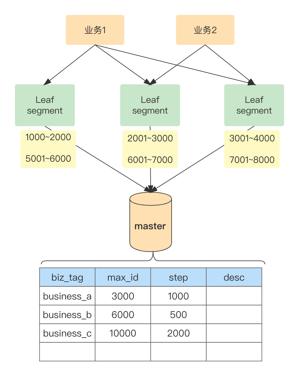 把数据库自增主键换成了计数法。每个业务分配一个biz_tag、并记录各业务最大id(max_id)、号段跨度(step)等数据。这样每次取号只需要更新biz_tag对应的max_id,就可以拿到step个id。