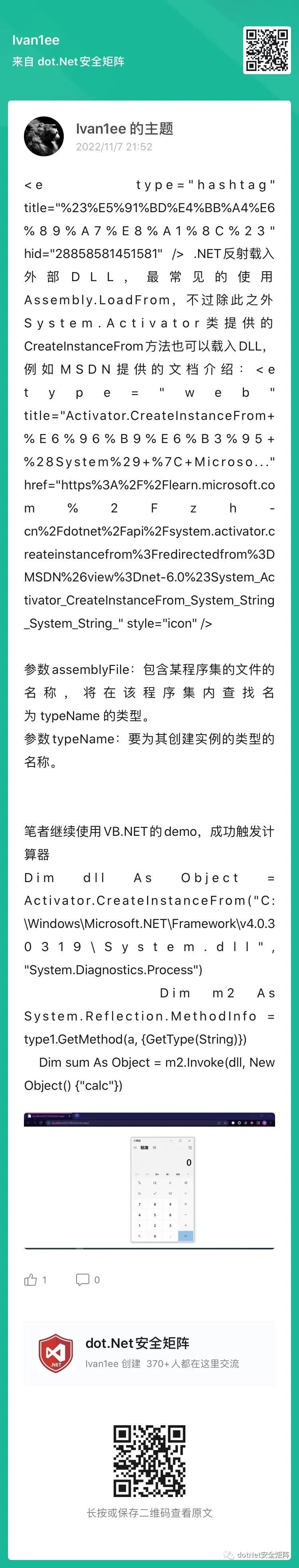 dotNet安全矩阵知识星球 — 聚焦于微软.NET安全技术,关注基于.NET衍生出的各种红蓝攻防对抗技术、分享内容不限于 .NET代码审计、 最新的.NET漏洞分析、反序列化漏洞研究、有趣的.NET安全Trick、.NET开源软件分享、. NET生态等热点话题、还可以获得阿里、蚂蚁、字节等大厂内推的机会.