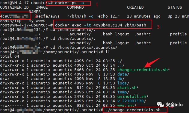 docker ps -a //查看容器,找到相应的id 网络安全交流q:830709780docker exec -it id /bin/bash //进入容器cd /home/acunetix/.acunetix./change_creadentials.sh输入新的管理员邮箱和密码如果输错了,后退键删不了,ctrl+u即可(清楚终端光标前的命令,对应的是ctrl+k,清楚光标后的命令)