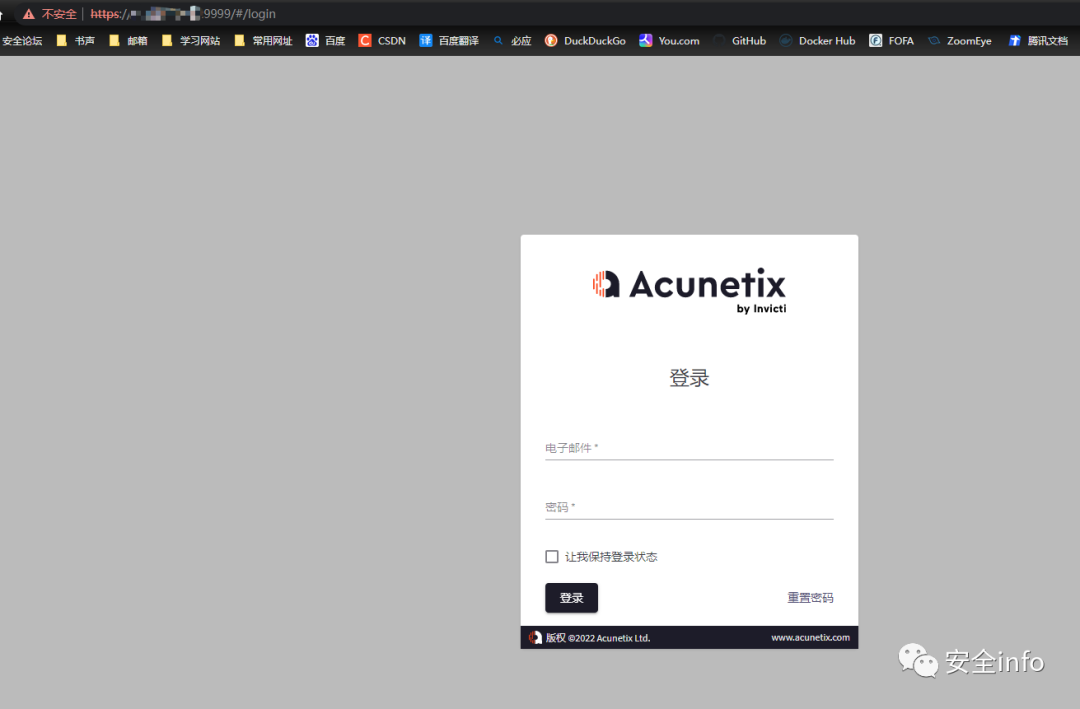 docker run -itd -p 9999:3443 --name my-awvs secfa/awvs5.输入ip:9999就可以查看awvs了