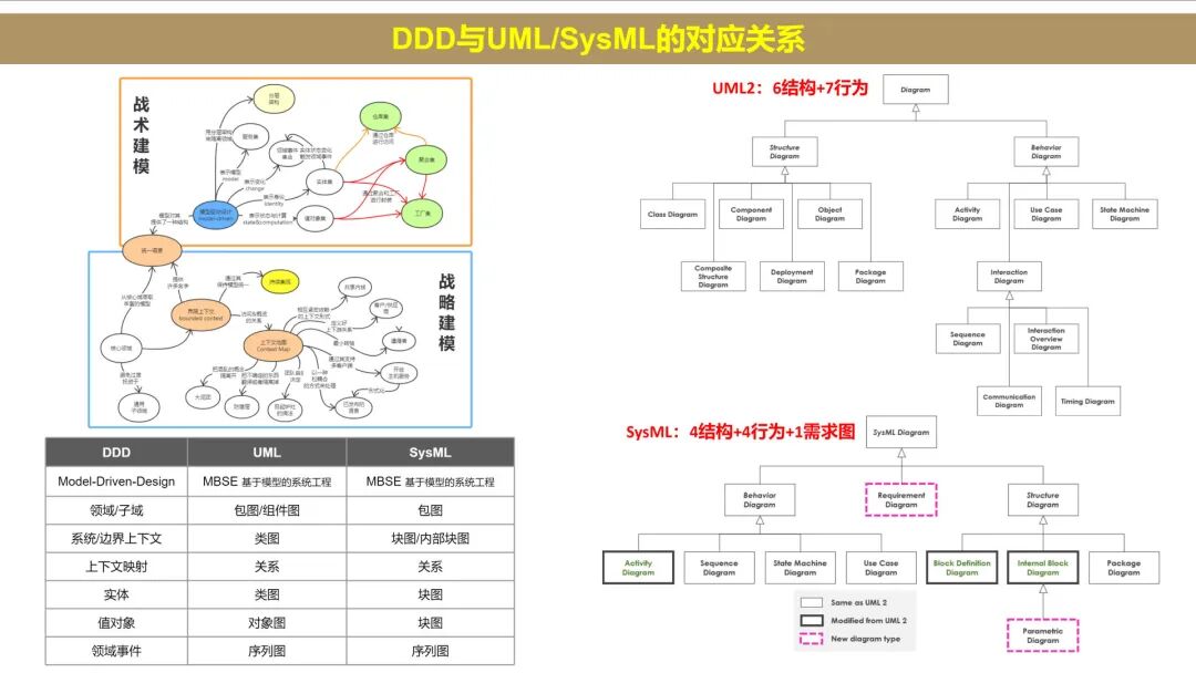 有一段时间,天天在琢磨 DDD/UML/SysML,脑子里各派的技术体系在翻江倒海地打架,偶然有一次把几幅图放在一起,突然间眼前灵光乍现,刹那间顿悟了,那一刻终于找到了解开密码的钥匙。从此困扰自己很久的 DDD 的几个核心概念,终于理清了头绪,完成了整个 DDD 大厦的最后一块拼图,感觉自己终于可以从路的这头走到路的那头,再从路的那头走到路的这头。注意下面这张图中左下角的表格,将 DDD/UML/SysML 之间的核心概念对应起来,三者之间的桥梁得以建立,从此一通百通。
