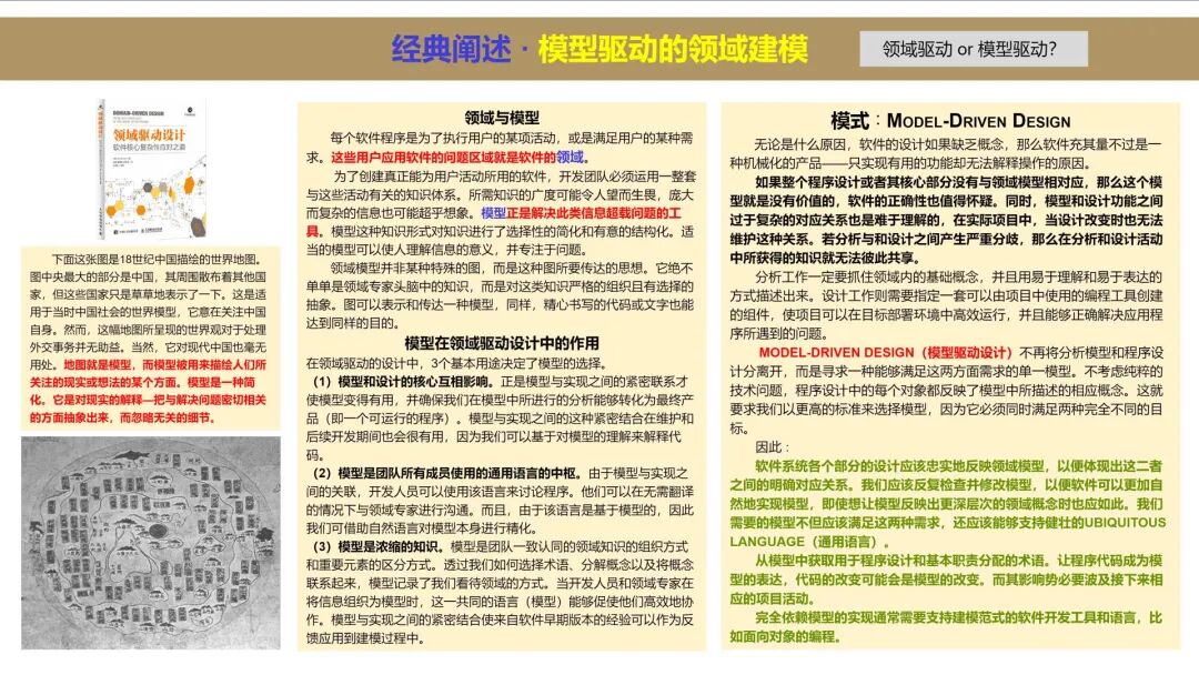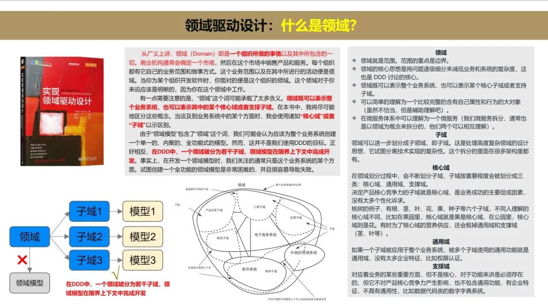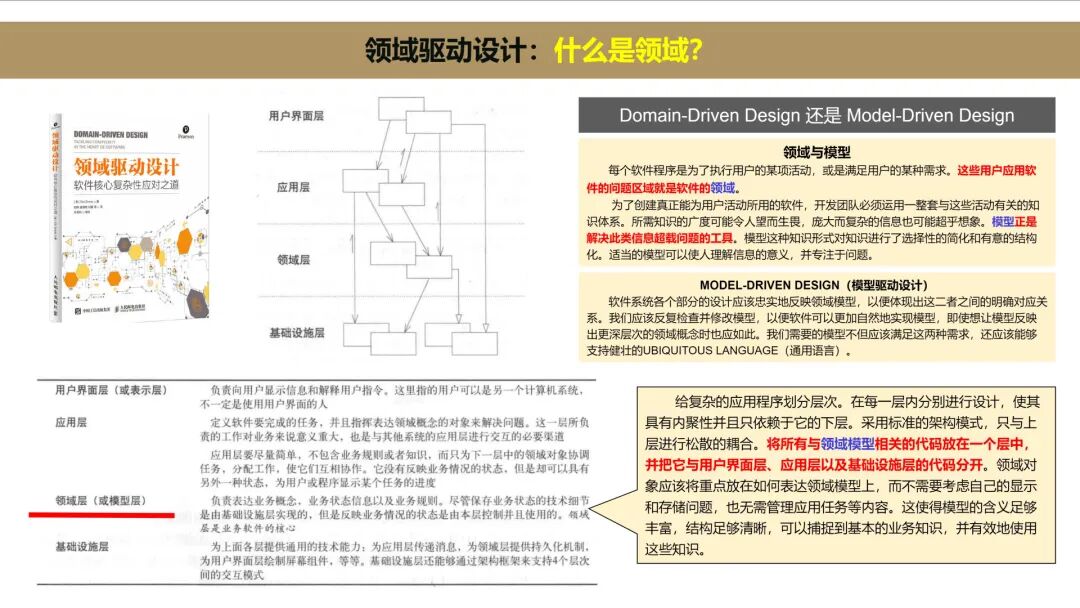 在《领域驱动设计·软件核心复杂性应对之道》这本书里,对什么是“领域”,只有简单的一句话:“每个软件程序是为了执行用户的某项活动,或是满足用户的某种需求。这些用户应用软件的问题区域就是软件的领域。” 除此之外,讲的更多的是“模型” 或者“领域模型”,纵观全书,“Model-Driven Design” 是其核心概念之一。某种程度上,把“领域驱动设计”改为“模型驱动设计”,一点问题都没有,甚至“模型驱动设计”更能体现整本书的精髓。
