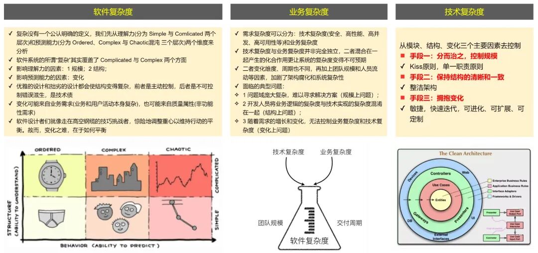 复杂度也许永远不能消除,但我们可以分析复杂度,进而管理复杂度。在软件开发领域,大体上可以将复杂度分为三类:软件本身固有的复杂度,业务逻辑带来的复杂度,以及技术复杂度。