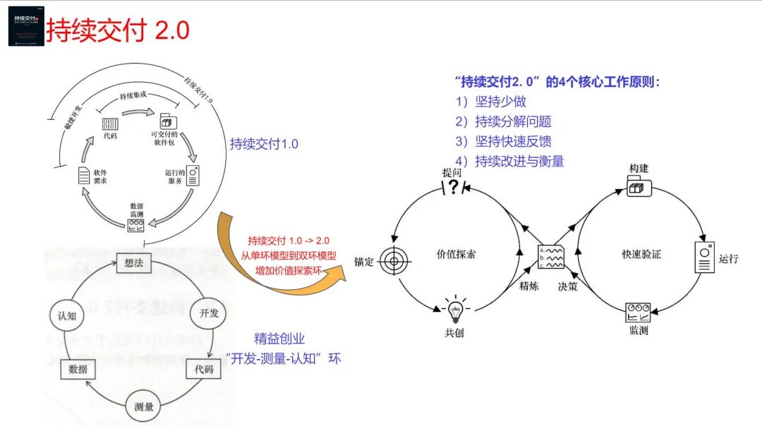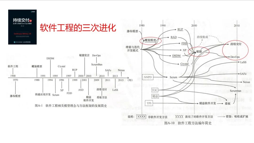 二十年后的今天,敏捷开发和极限编程早已式微,但乔梁老师的著作《持续交付》给我们提供了新的视角。乔梁老师在其著作《持续交付》里梳理了软件工程的进化史。最近两三年,作为腾讯外聘高级管理顾问,其“价值探索-快速验证”的持续交付 2.0 双环模型,令人印象深刻。