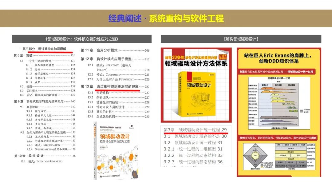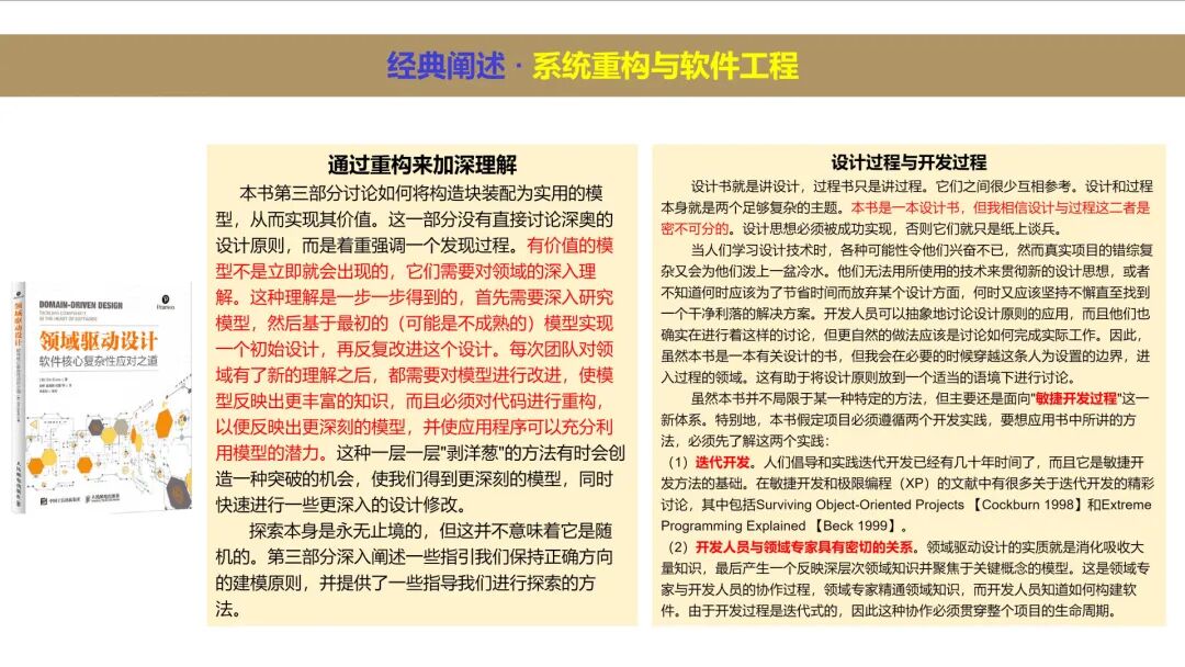 领域驱动设计的重点在系统设计阶段,但领域驱动设计同样将重构作为重要内容。《领域驱动设计·软件核心复杂性应对之道》这本书第三部分共 6 章的篇幅在介绍重构。看其内容,名为重构,实则仍然是设计,例如概念建模、柔性设计、分析模式、设计模式等等,基本都是一些偏宏观的设计内容。内容上,跟 Martin Fowler 的《重构:改善既有代码的设计》还是有很大区别。