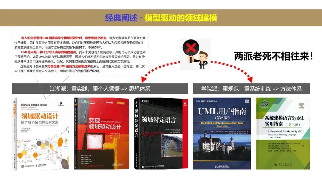 DDD 自创立以来,到现在近 20 年,这期间 DDD 野蛮生长,逐渐变为一个杂乱无章的的技术丛林,一百本书有一百种讲法,包罗万象。而同样源远流长的 UML/SysML/RUP 等专业方法,却逐渐式微。