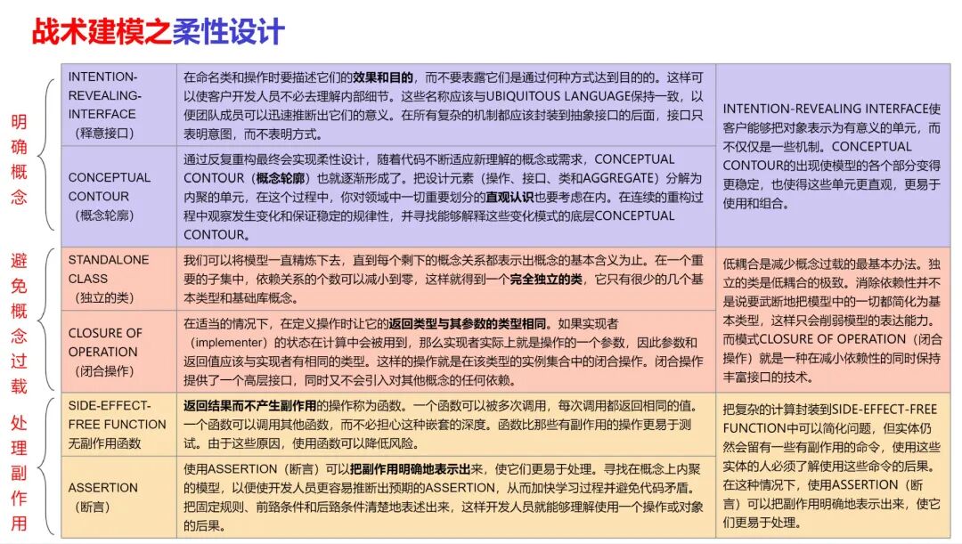 柔性设计:列举了一些设计原则,类似于常见的软件设计原则,只是换了一种说法。例如通过明确概念、避免概念过载、处理副作用等做法,得到的是一个高内聚低耦合的设计。