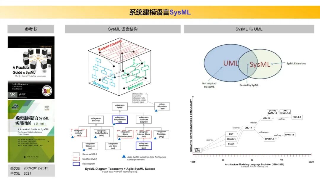 学院一派,仍在不断精进,从多年前发展起来的 UML,到新近在其基础上发展起来的 SysML,建模技术正在从软件行业逐步拓展到一般技术行业。UML 强绑定于面向对象,SysML 去除了这种绑定,因而可用于更广泛的领域。在软件开发领域,一般学会 UML 就可以了,如果所属业务不采用面向对象开发模式的话,SysML 则是更适合的建模工具。