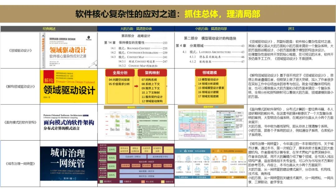 从我看过的几本经典书籍来看,软件核心复杂性的应对之道,不外乎就是:抓住总体,理清局部。
